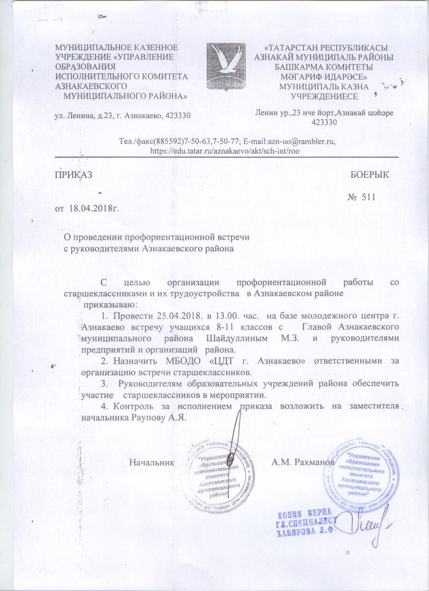 Приказ о проведении профориентационной встречи с руководителями Азнакаевского муниципального района