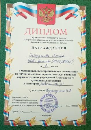 2 место в муниципальном турнире по шахматам им. Ф.М. Латыпова (Гараева Э., Гиззатуллин И.Д.)