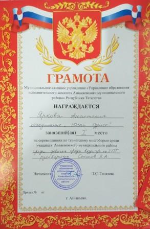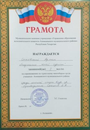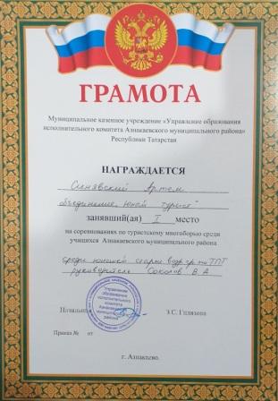 1 место в Республиканском турслете обучающхся Республики Татарстан ("Юные туристы", Соколов В.А.)