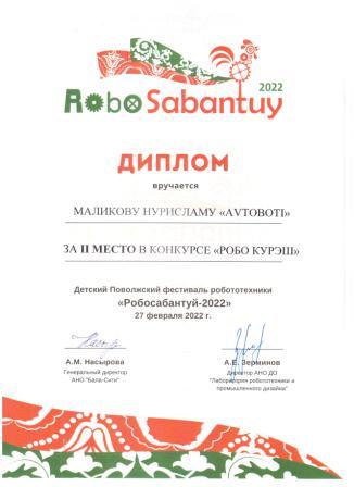 2 место в Поволжском фестивале робототехники "Робосабатуй - 2022" (Хаертдинов И.. Валиев Д.Р.)