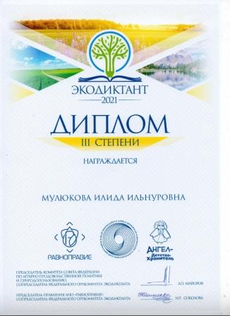 3 место во Всероссийском конкурсе "Экодиктант" (Мулюкова И.)