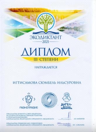 3 место во Всероссийском конкурсе "Экодиктант" (Игтисамова С.)
