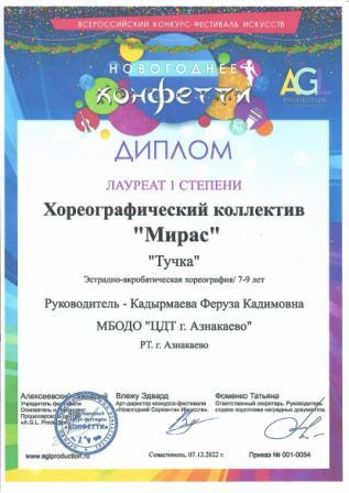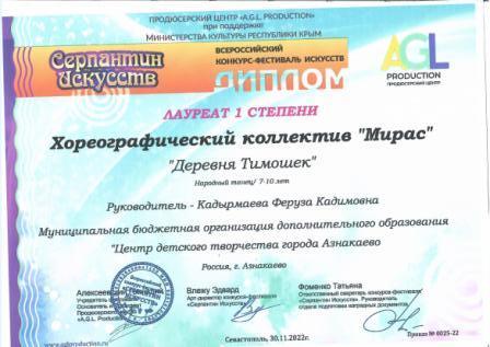 Лауреат 1 степени на Всероссийском конкурсе-фестивале искусств (коллектив "Мирас", Кадырмаева Ф.К.)