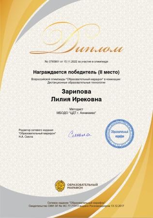 1 место во Всероссийском конкурсе "Мое призвание- педагог" (Зайниева Р.З.)