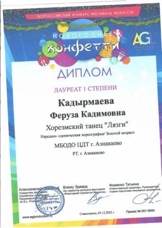 Лауреат 1 степени на Всероссийском конкурсе-фестевале искусств (Кадырмаева Ф.К.)