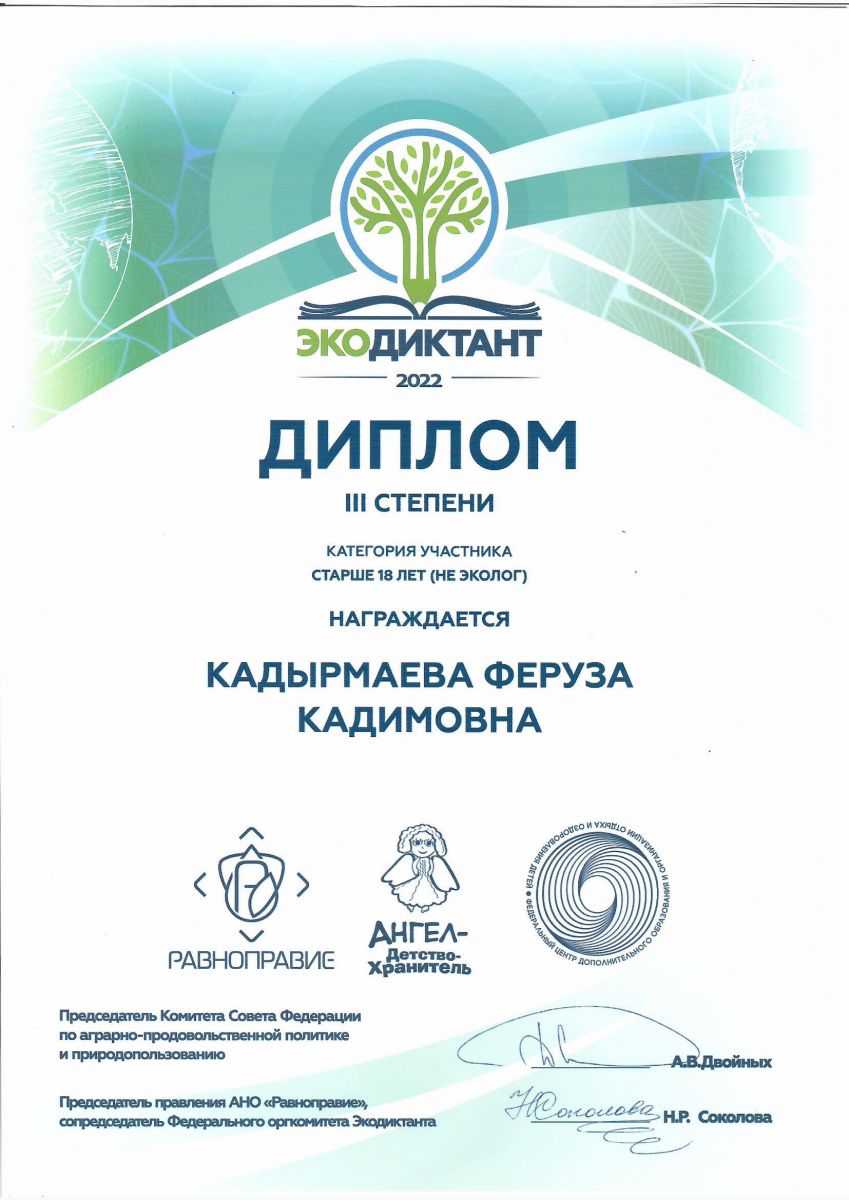 2 место на Всероссийском экодиктанте (Кадырмаева Ф.К.)