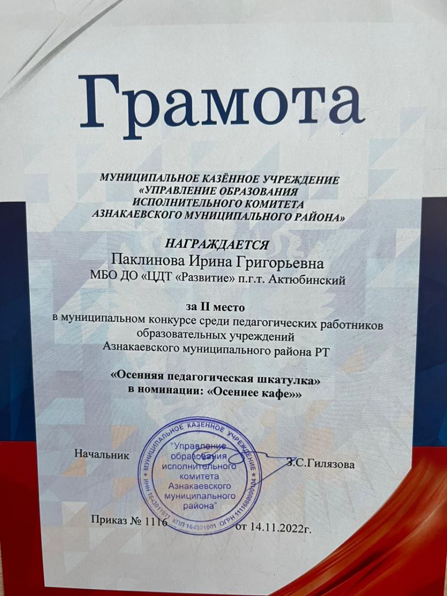 Грамота за 1 место в муниципальном конкурсе "День леса", педагог Паклинова И.Г.