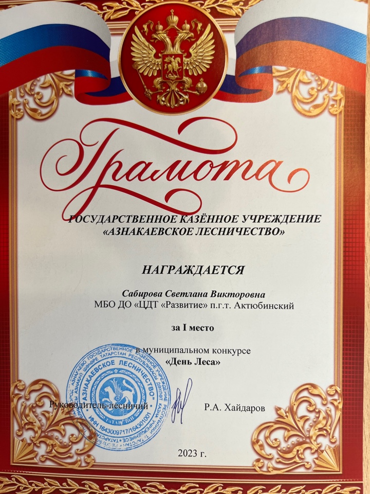 Грамота за 1 место в муниципальном конкурсе "День леса", педагог Сабирова С.В.