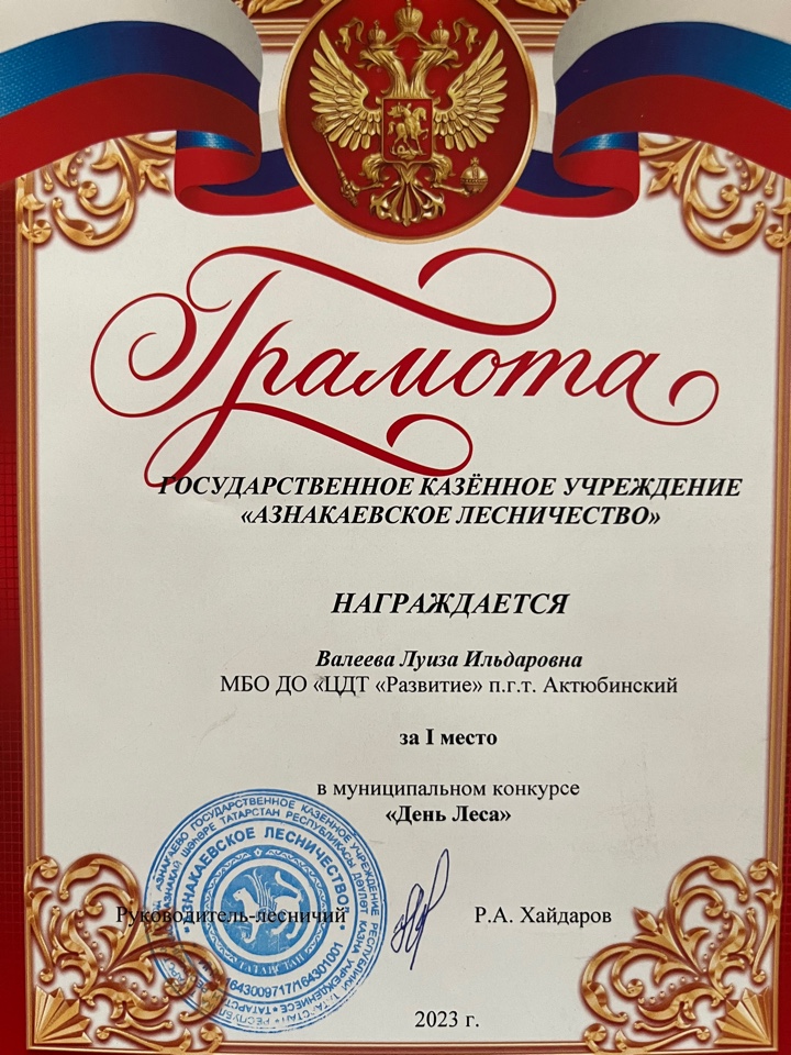 Грамота за 1 место в муниципальном конкурсе "День леса", педагог Валеева Л.И.