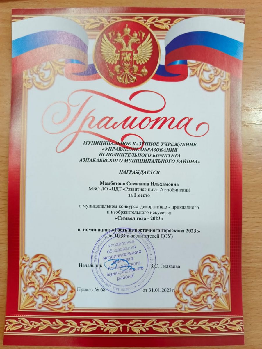 Грамота за 1 место в муниципальном конкурсе "День леса", педагог Мамбетова С.И.
