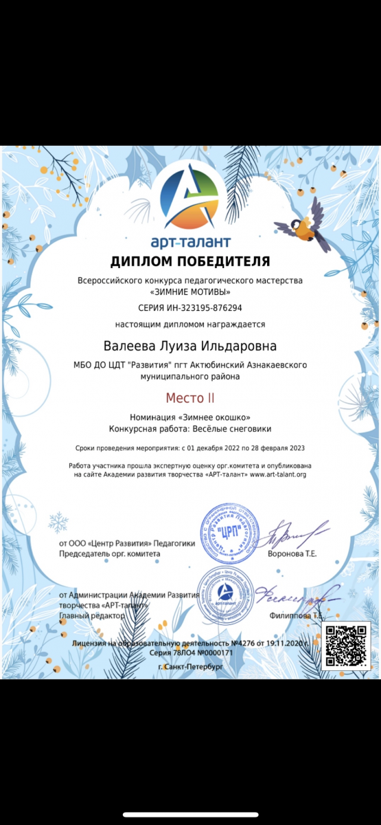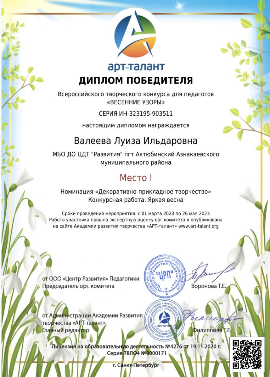 Лауреат 1 степени в I Всероссийском конкурсе "Краски осени", педагог Шарипова Г.Ш.