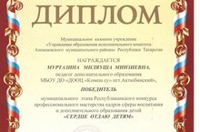 ПДО Муртазина М.М. стала победителем муниципального этапа Республиканского конкурса профессионального мастерства кадров сферы воспитания и дополнительного образования детей "Сердце отдаю детям".