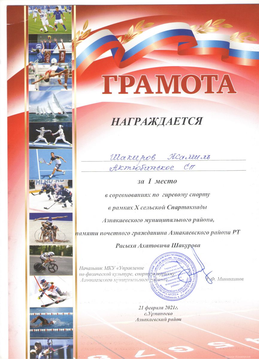 Балалар иҗат үзәгенең Тренер-укытучысы Азнакай муниципаль районының Х авыл Спартакиадасында катнашты һәм гер спорты буенча ярышларда 1 урынны яулады.