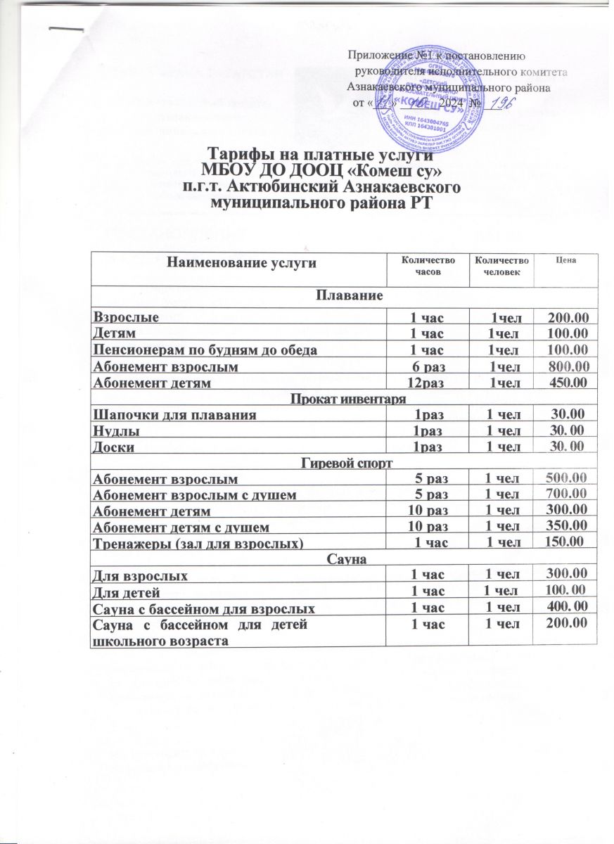 Тарифы на платные услуги МБОУ ДО ДООЦ "Комеш су" на 2024-2025гг.