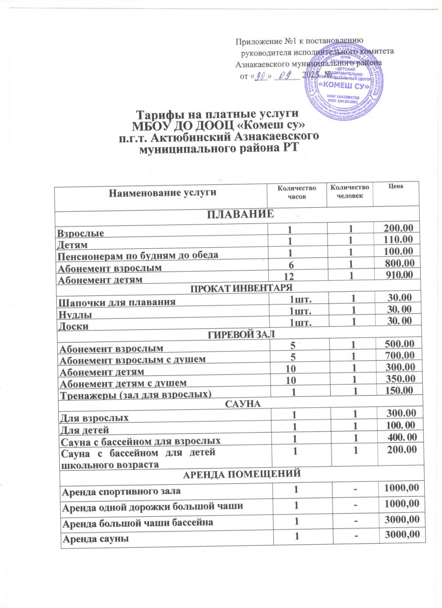 Тарифы на платные услуги МБОУ ДО ДООЦ "Комеш су" на 2025-2026гг.