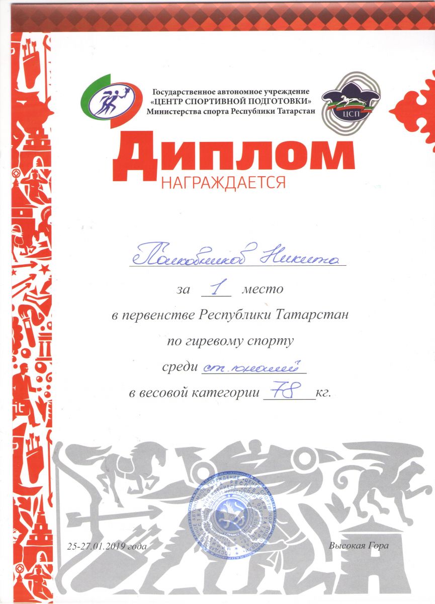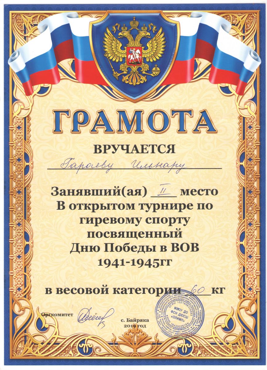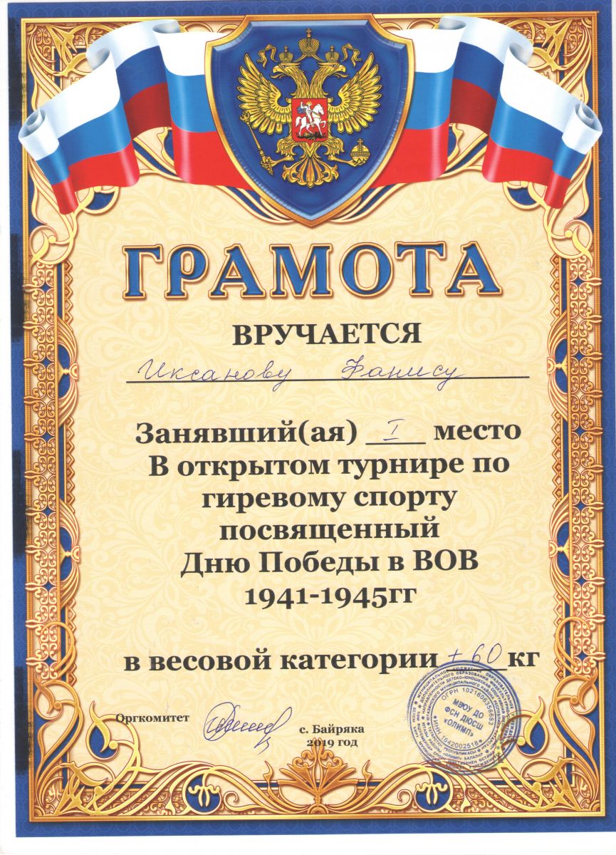 Грамота за 1 место в открытом турнире по гиревому спорту,Иксанов Ф, 2019г.