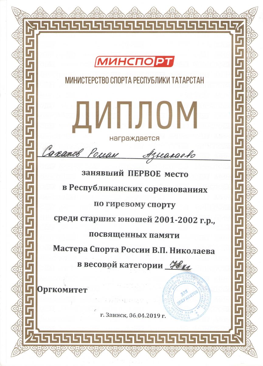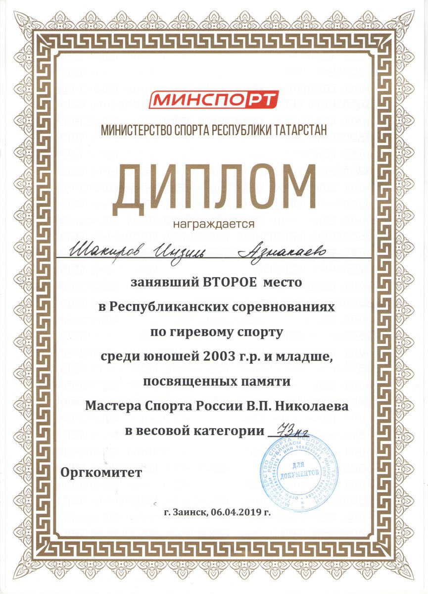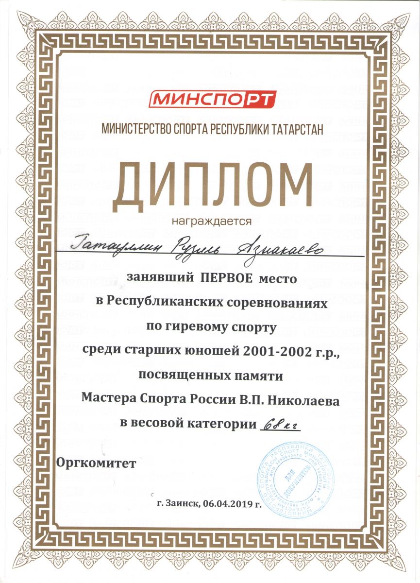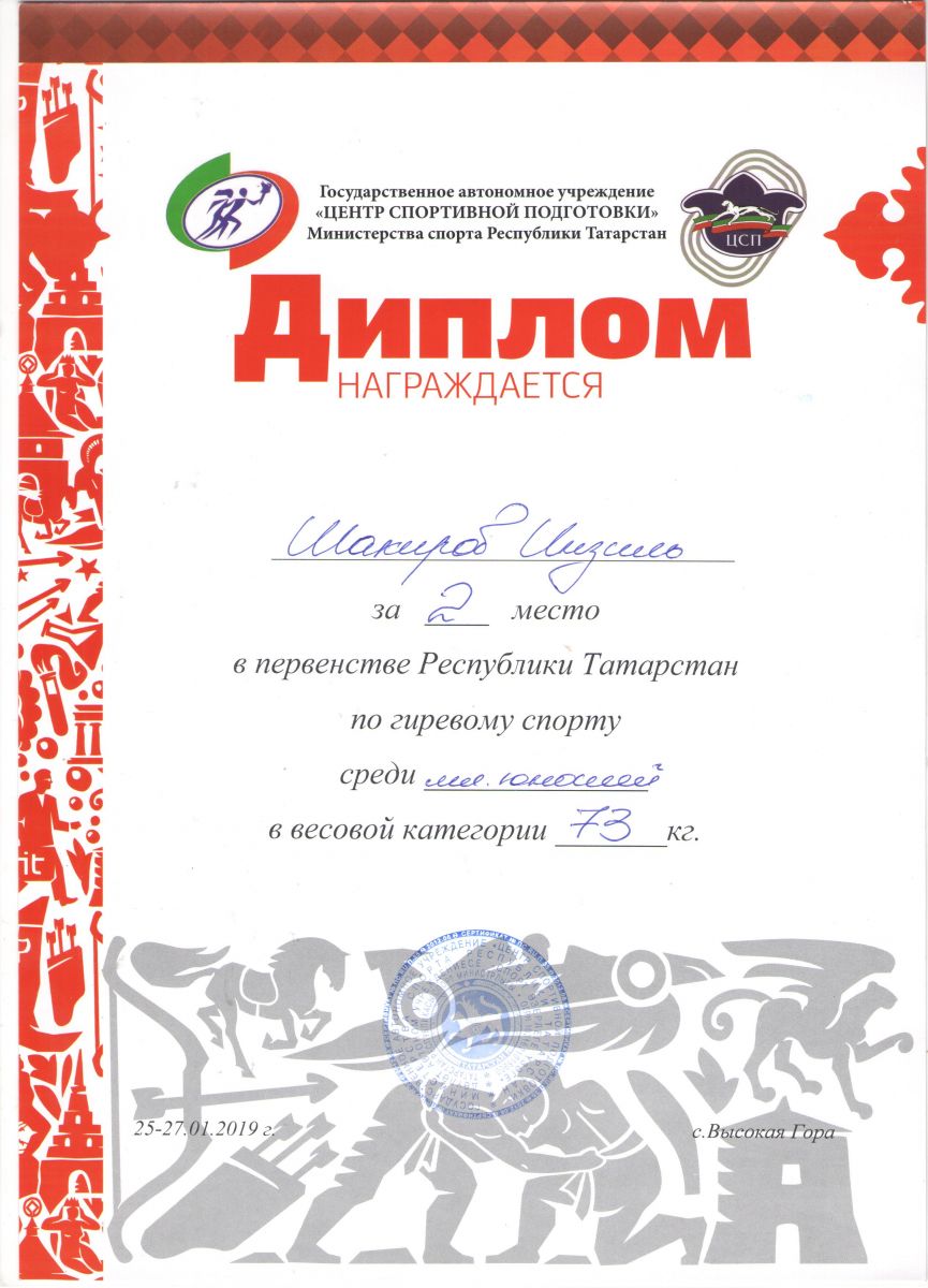 Грамота за 1 место в открытом турнире по гиревому спорту,Иксанов Ф, 2019г.