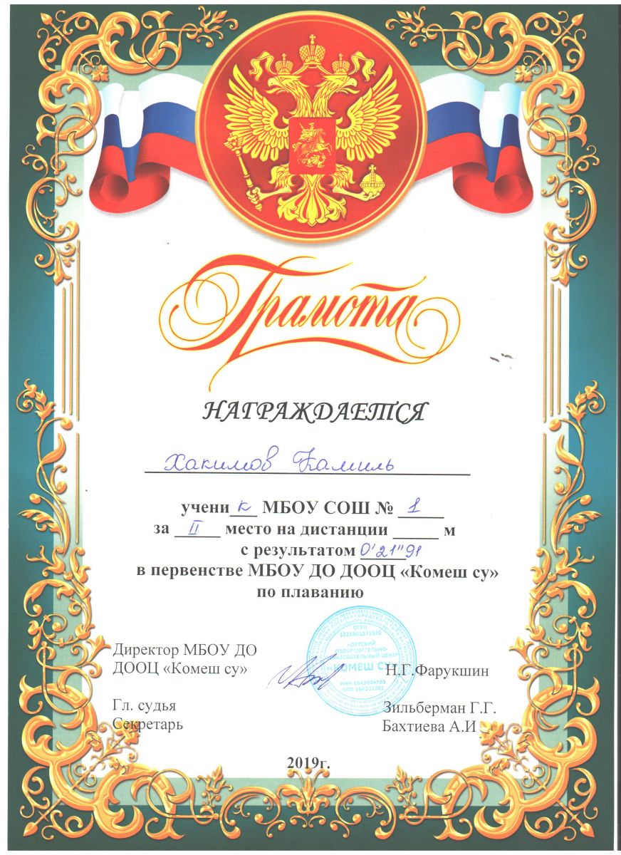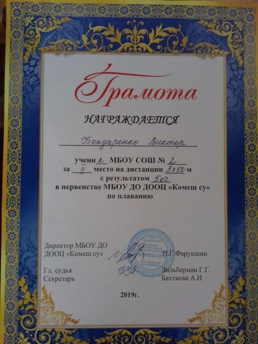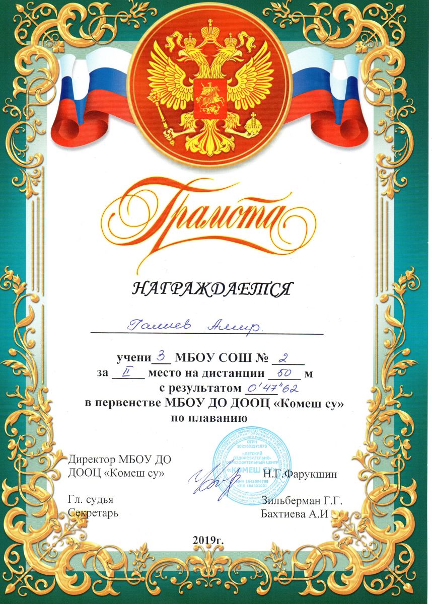Грамота за 2 место по плаванию, Миннеханов Фархат, 2019г.