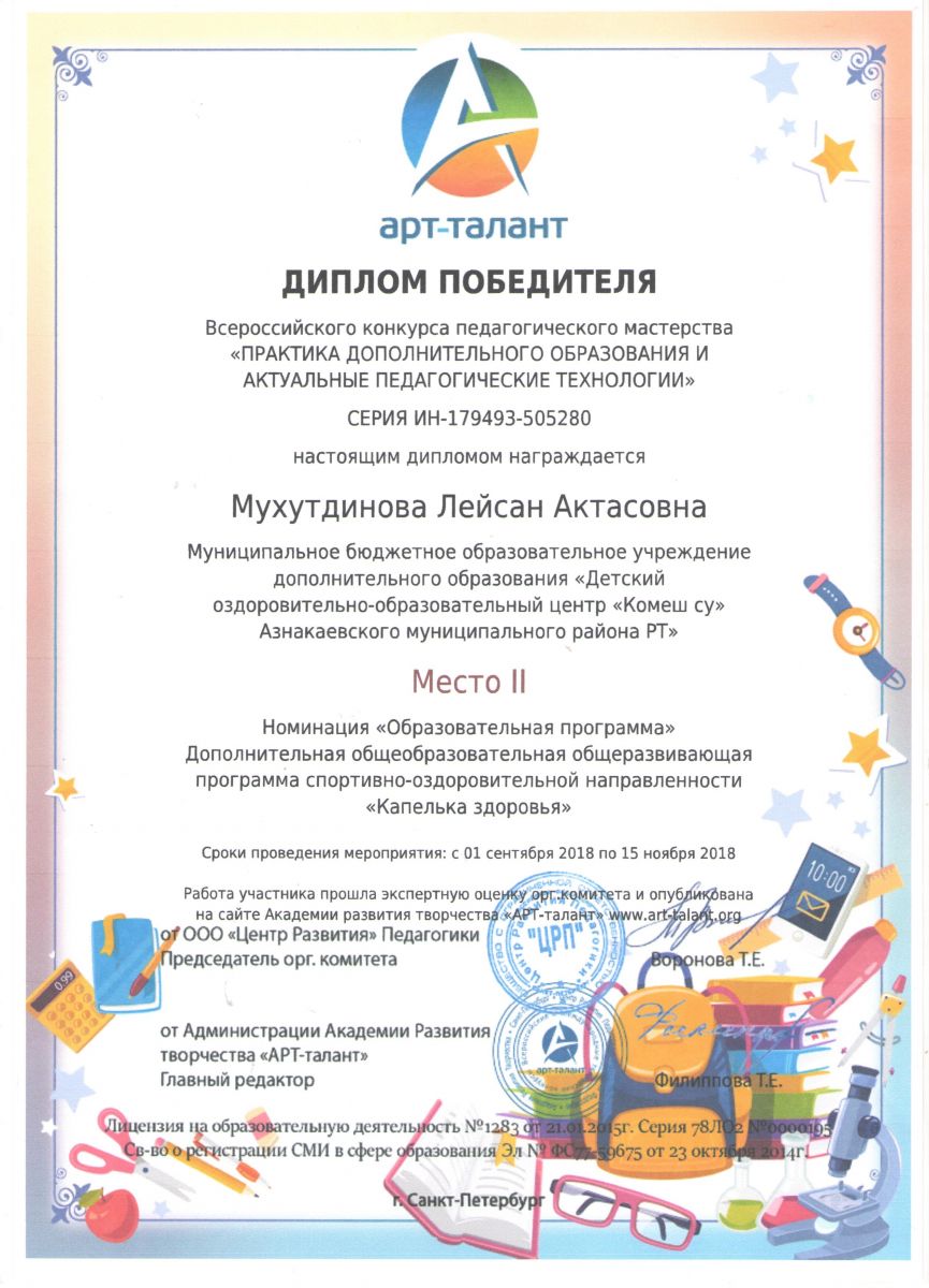 Благодарность за поддержку образовательного проекта, 2018г., Бахтиева А.И.
