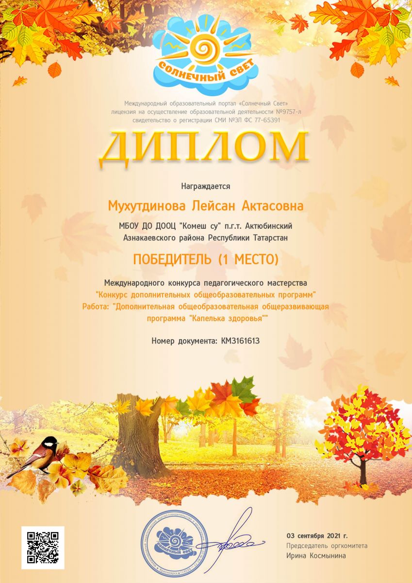 Диплом 1 место во Всероссийском конкурсе "Педагог - Лидер" - 3, Муртазина М.М., 2022г.