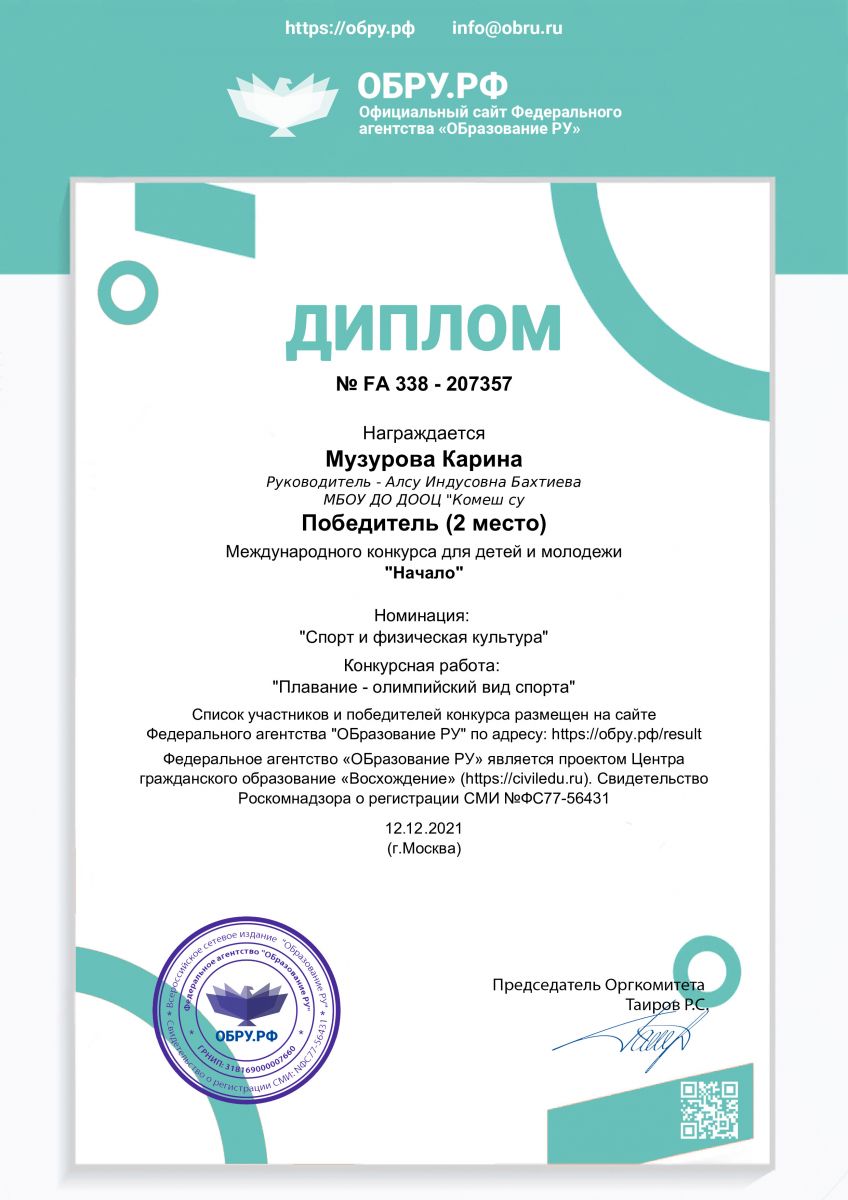 Диплом 2 место Международного конкурса для детей и молодежи "Начало", Бахтиева А.И., 12.12.2021г.