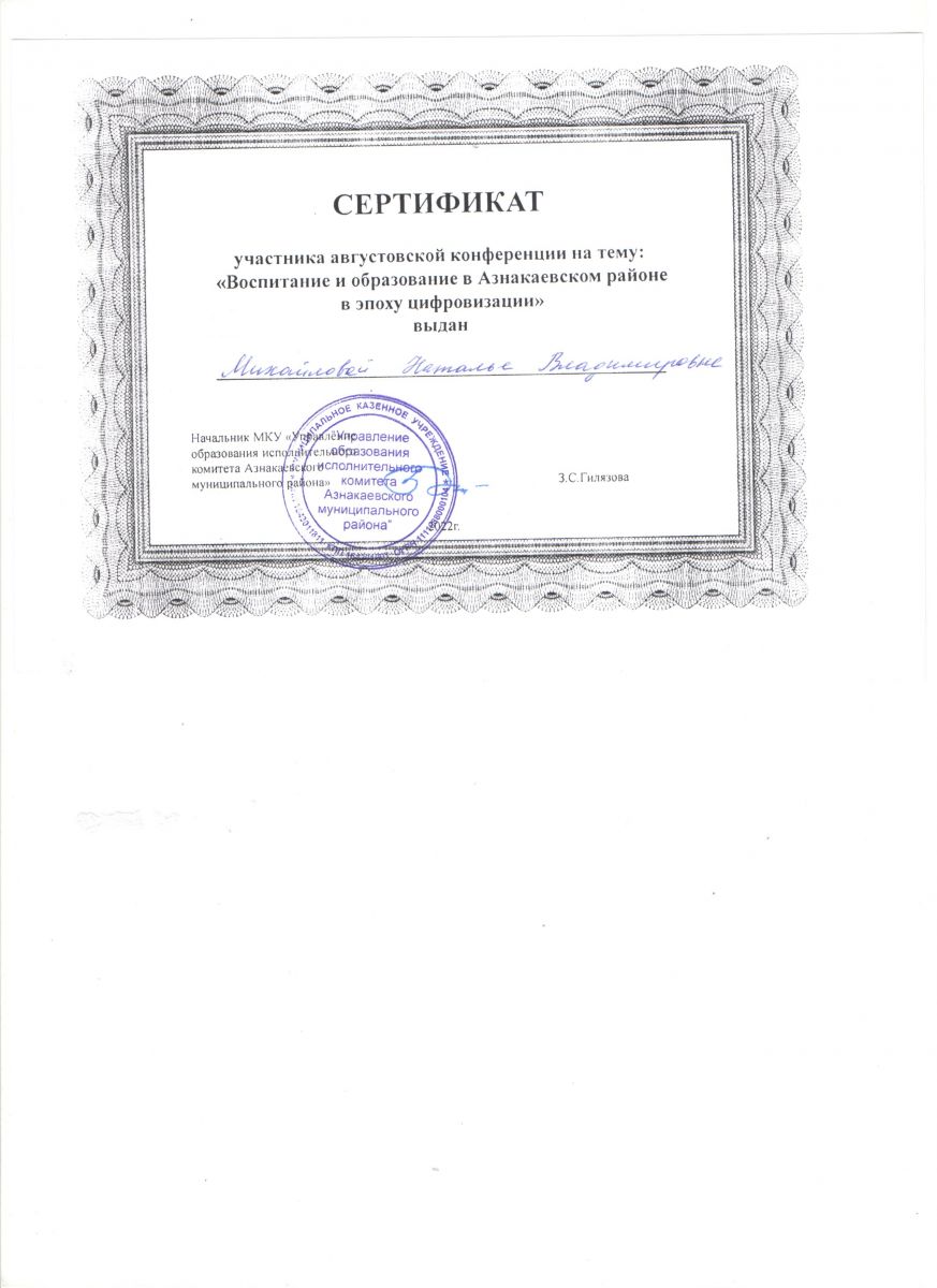 Сертификат участника августовской конференции на тему: "Воспитание и образование в Азнакаевском районе в эпоху цифровизации", Абдурахманова Г.М., 2022г.