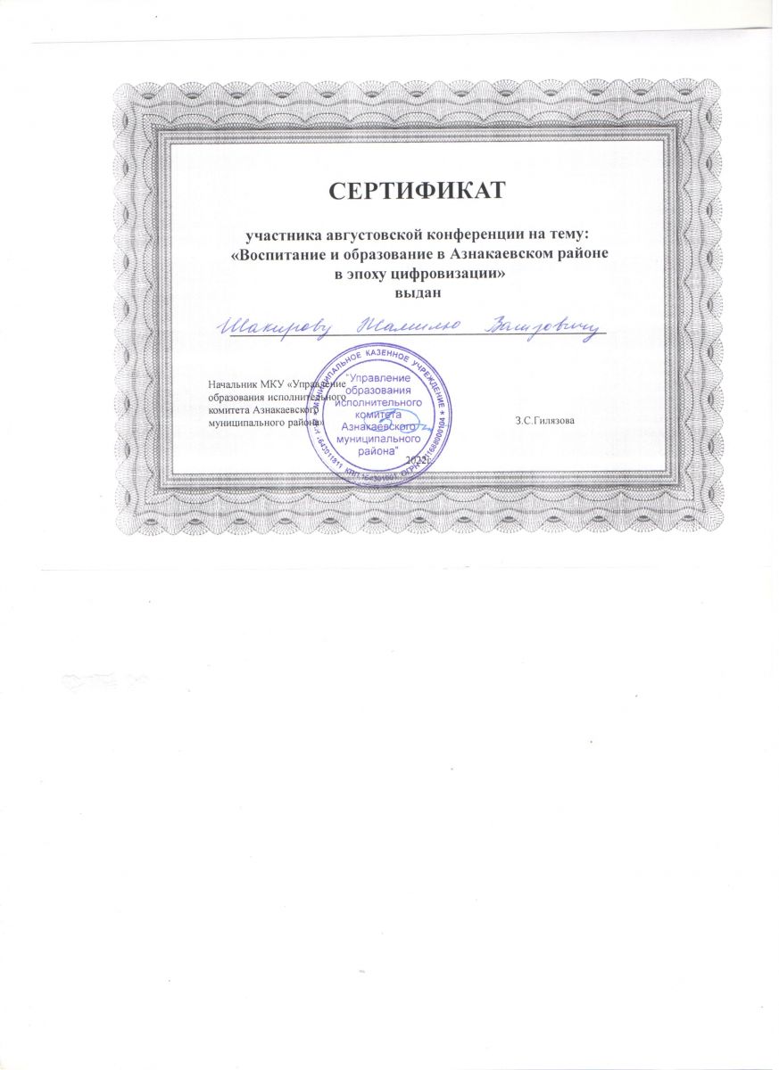 Сертификат участника августовской конференции на тему: "Воспитание и образование в Азнакаевском районе в эпоху цифровизации", Фарукшин Н.Г., 2022г.