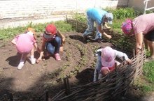 Кечкенә укучылар бакчада чәчкә түтәлләрен чүптән арындыралар.Ял белән хезмәт бергә булганда гына күңелле була.
