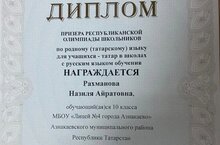 26 февраля ученица 10А класса нашего лицея Рахманова Назиля завоевала призовое место в Республиканской олимпиаде школьников по татарскому языку. Подготовила призера учитель татарского языка и литературы Сабирова Х.Г.