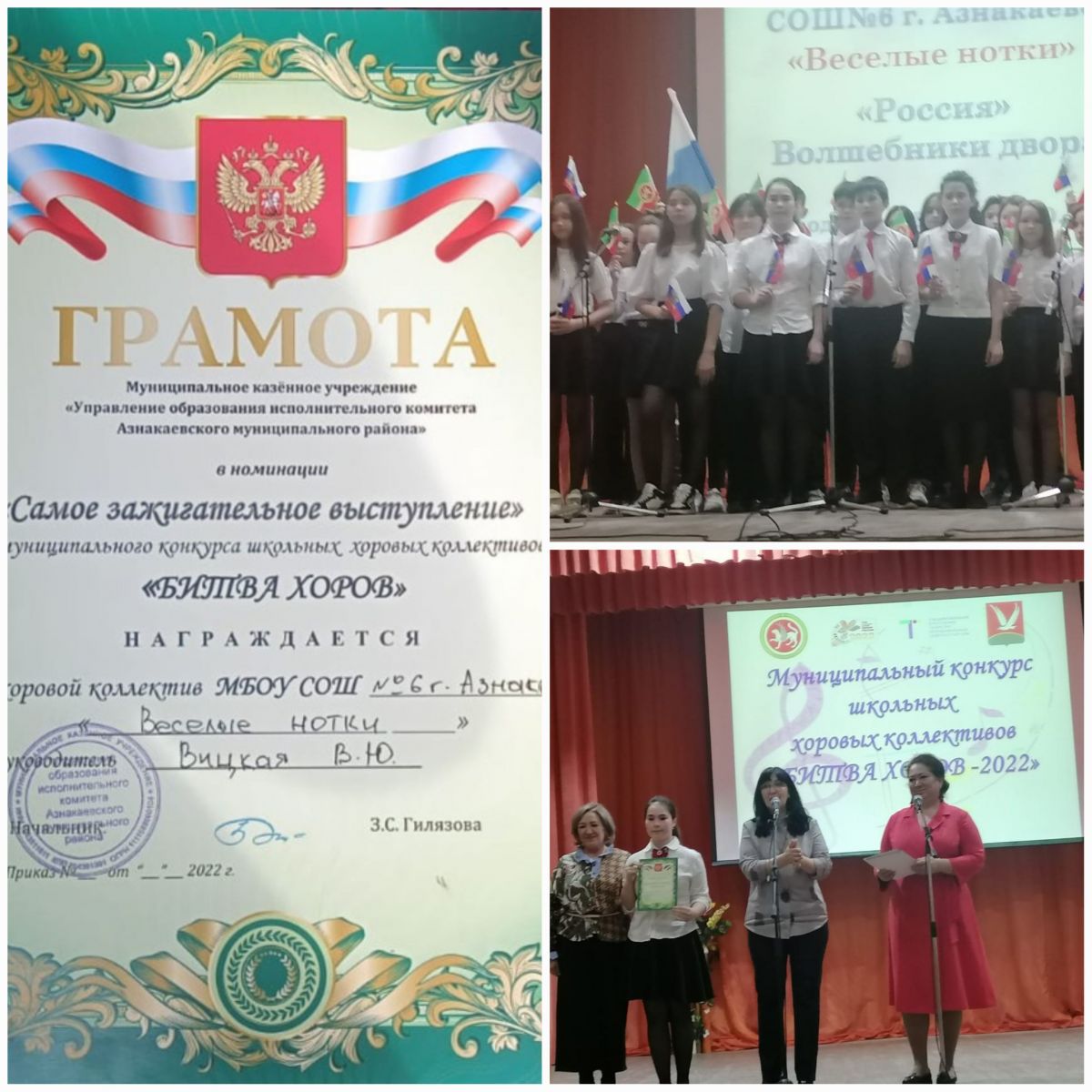 Наш хоровой коллектив "Весёлые нотки" одержал победу в номинации "Самое зажигательное выступление" . Руководитель Вицкая В.Ю. Такое грандиозное мероприятие проводится в Азнакаевском районе четвертый раз и нацелена на выявление и поддержку талантов, популяризации хорового пения.Безнең "Весёлые отки" хор коллективы "Иң дәртле чыгыш" номинациясендә җиңү яулады . Җитәкчесе: Вицкая В. Ю. Азнакай районында мондый грандиоз чара дүртенче тапкыр үткәрелә һәм талантларны ачыклау һәм аларга ярдәм итү, хор җырлавын популярлаштыруга юнәлдерелгән.