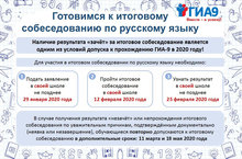 9 сыйныфларда рус теле буенча 2020нең йомгаклау әңгәмәсе узачак. 12 февраль (икенче чәршәмбе). 2020-11 март һәм 18 май йомгаклау әңгәмәсен үткәрүнең өстәмә даталары. 9 нчы сыйныф укучылары өчен рус теле буенча йомгаклау әңгәмәсе (алга таба – йомгаклау әңгәмәсе) төп гомуми белем бирү программалары буенча дәүләт йомгаклау аттестациясенә керү шартларының берсе буларак үткәрелә. Йомгаклау әңгәмәсенең нәтиҗәсе булып «зачет» яки «незачет»тора. Йомгаклау әңгәмәсе дәүләт аккредитациясе булган төп гомуми белем бирү программалары буенча белем бирү эшчәнлеген гамәлгә ашыручы мәгариф оешмаларында, ДЙА-9 катнашучыларының уку урыны буенча үткәрелә.