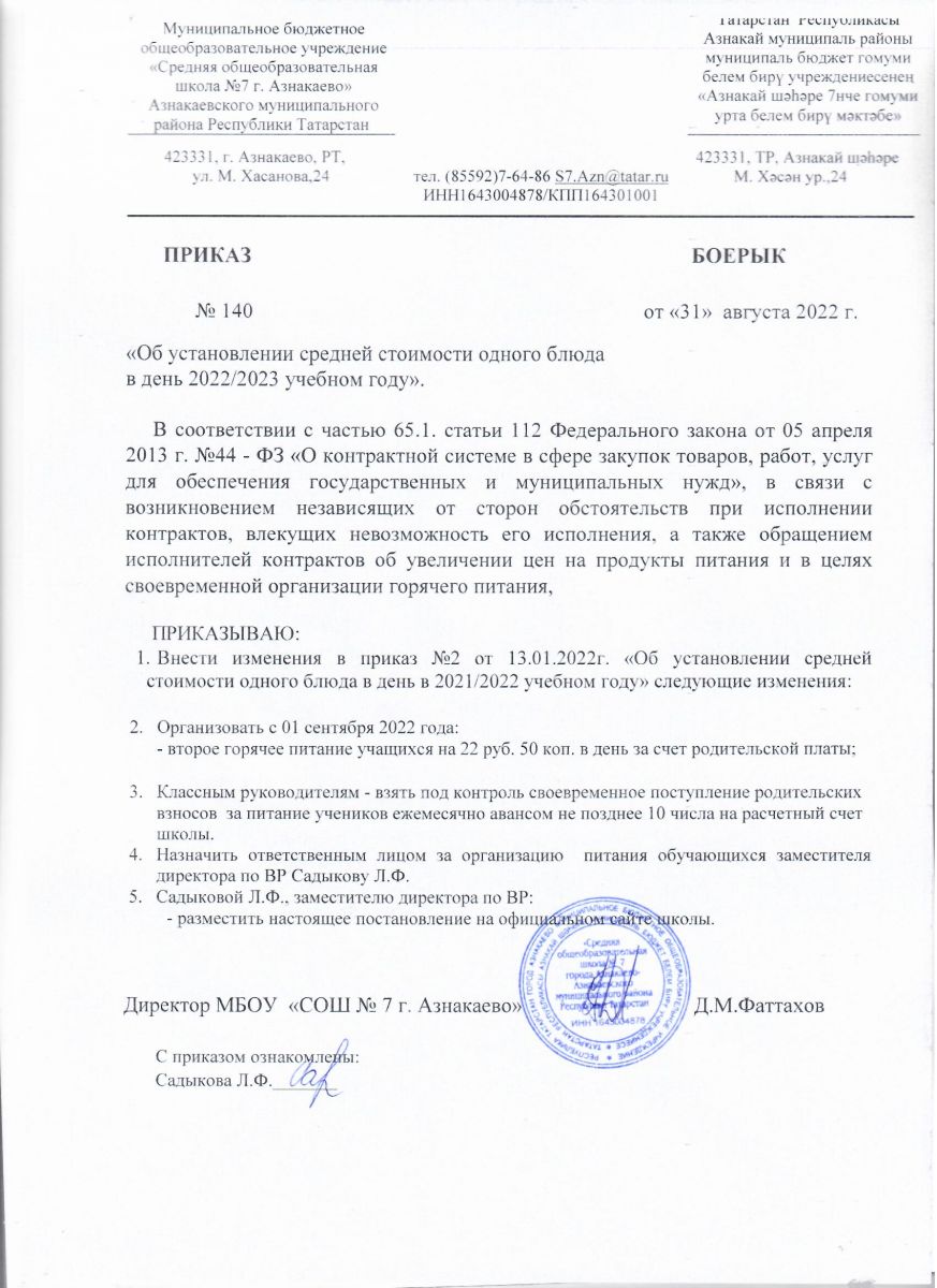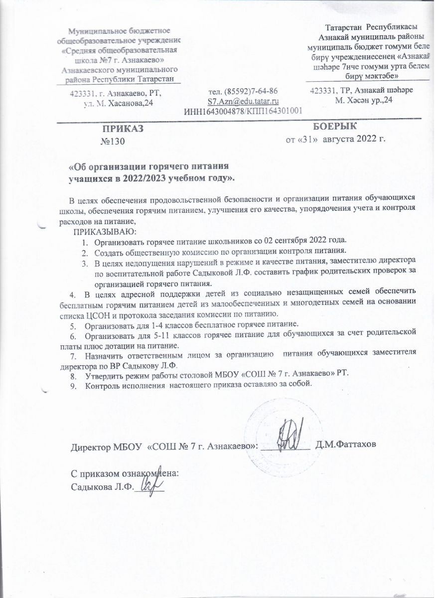 Приказ № 130 от 31.08.2022 г. Об организации горячего питания учащихся