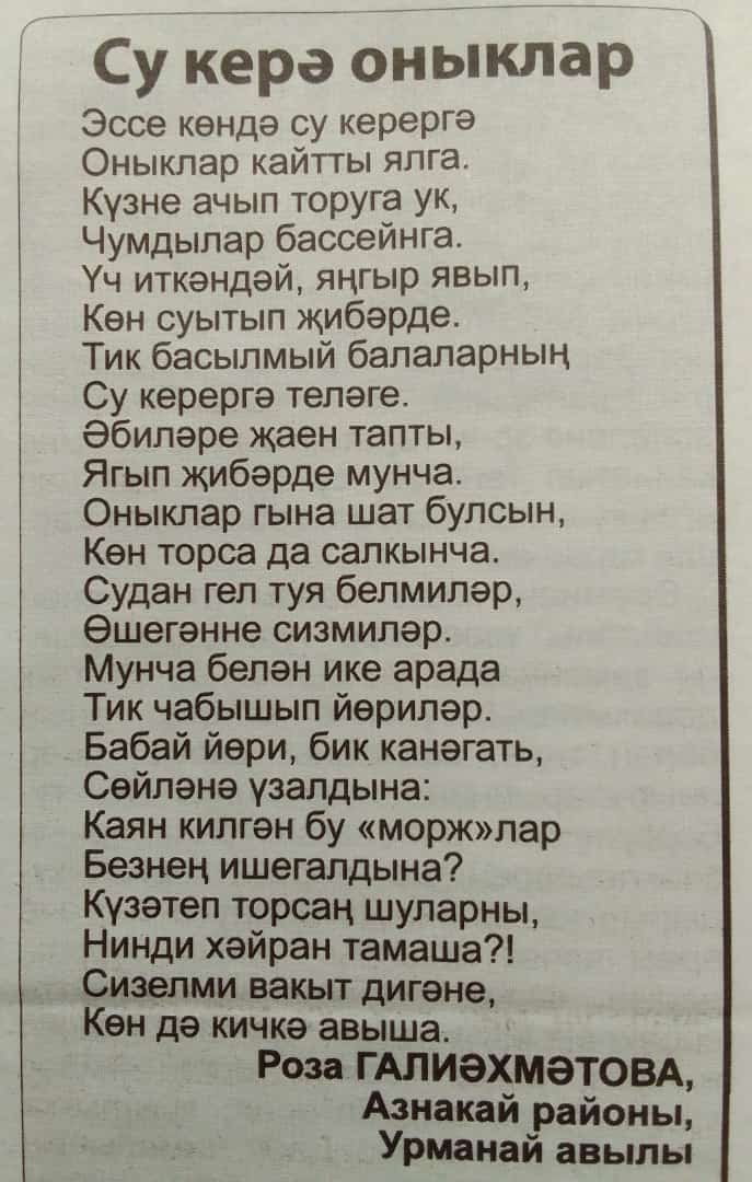 Бабушка ученицы 4А класса написала стихотворение "Су керэ оныклар", своим внукам. Стихотворение было опубликовано в газете "Маяк".