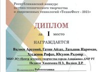 Диплом I степени Гатин Айзат. Республиканский конкурс научно- технического творчества "Технофест -2021"
