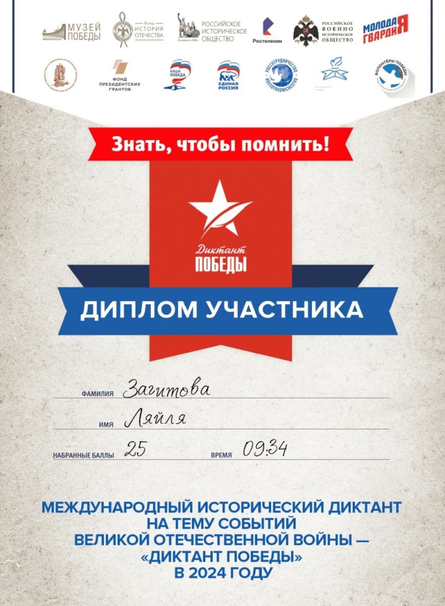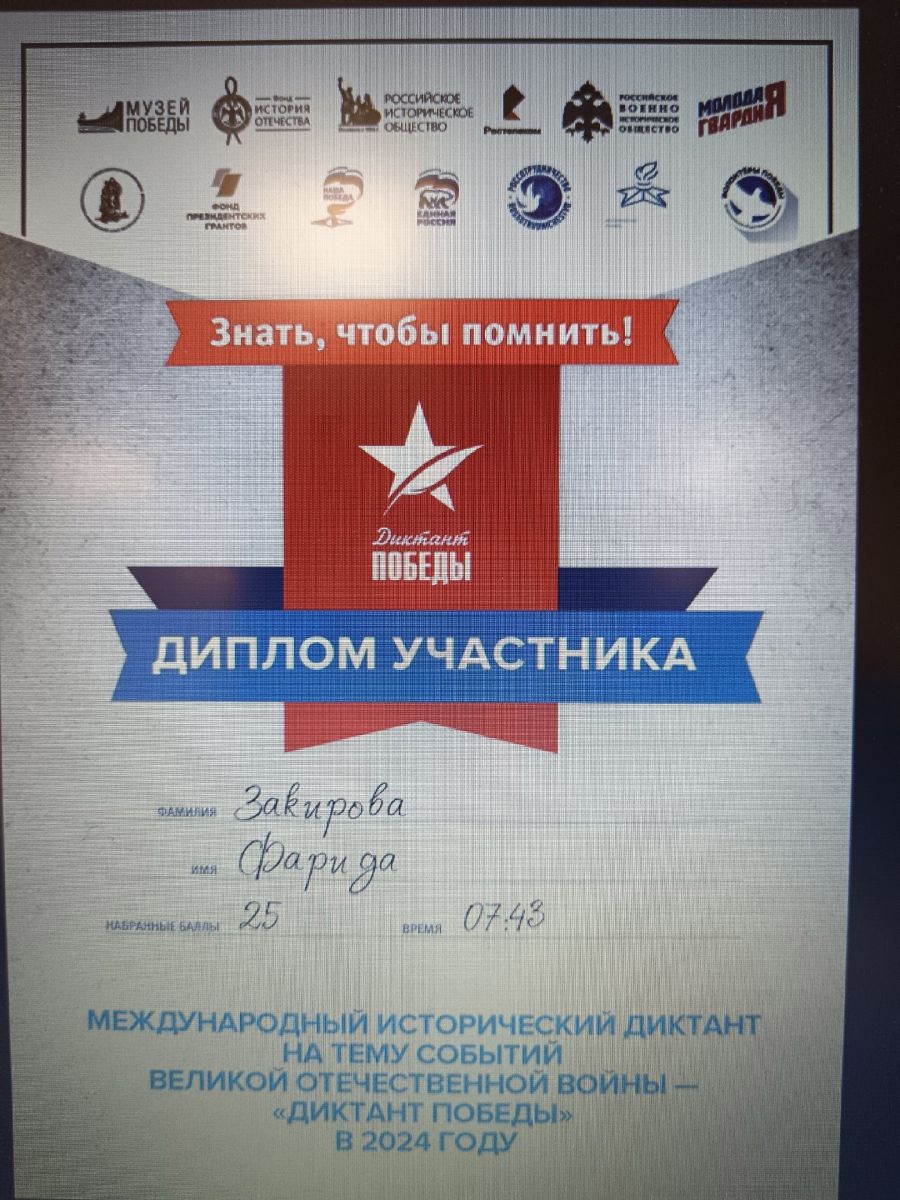 26 нчы апрельдә «Җиңү диктанты» Халыкара тарихи акциясе узды. Акция мәктәп укучыларында илнең героик үткәне вакыйгаларына кызыксыну уяту, тарих буенча белемнәрен тикшерү, яңа мәгълүматны белү максатыннан үткәрелә.