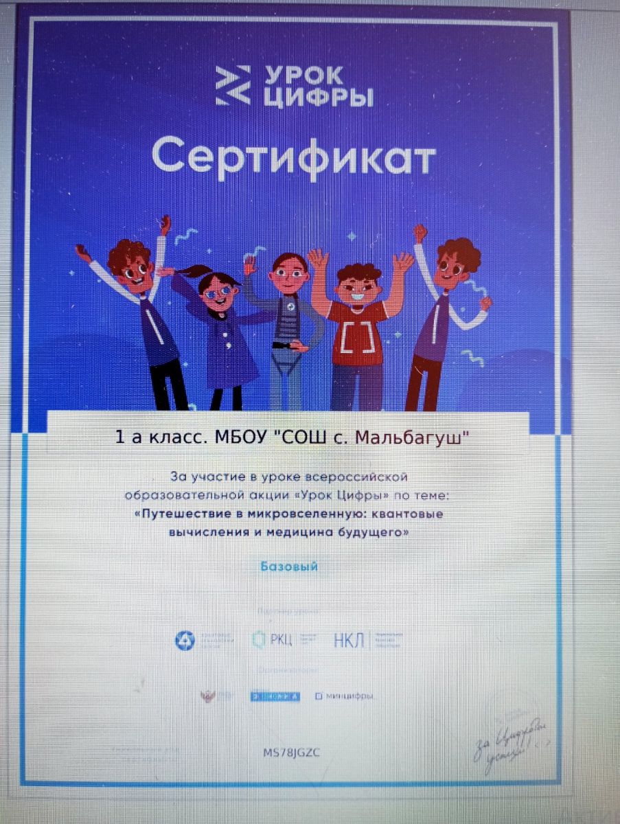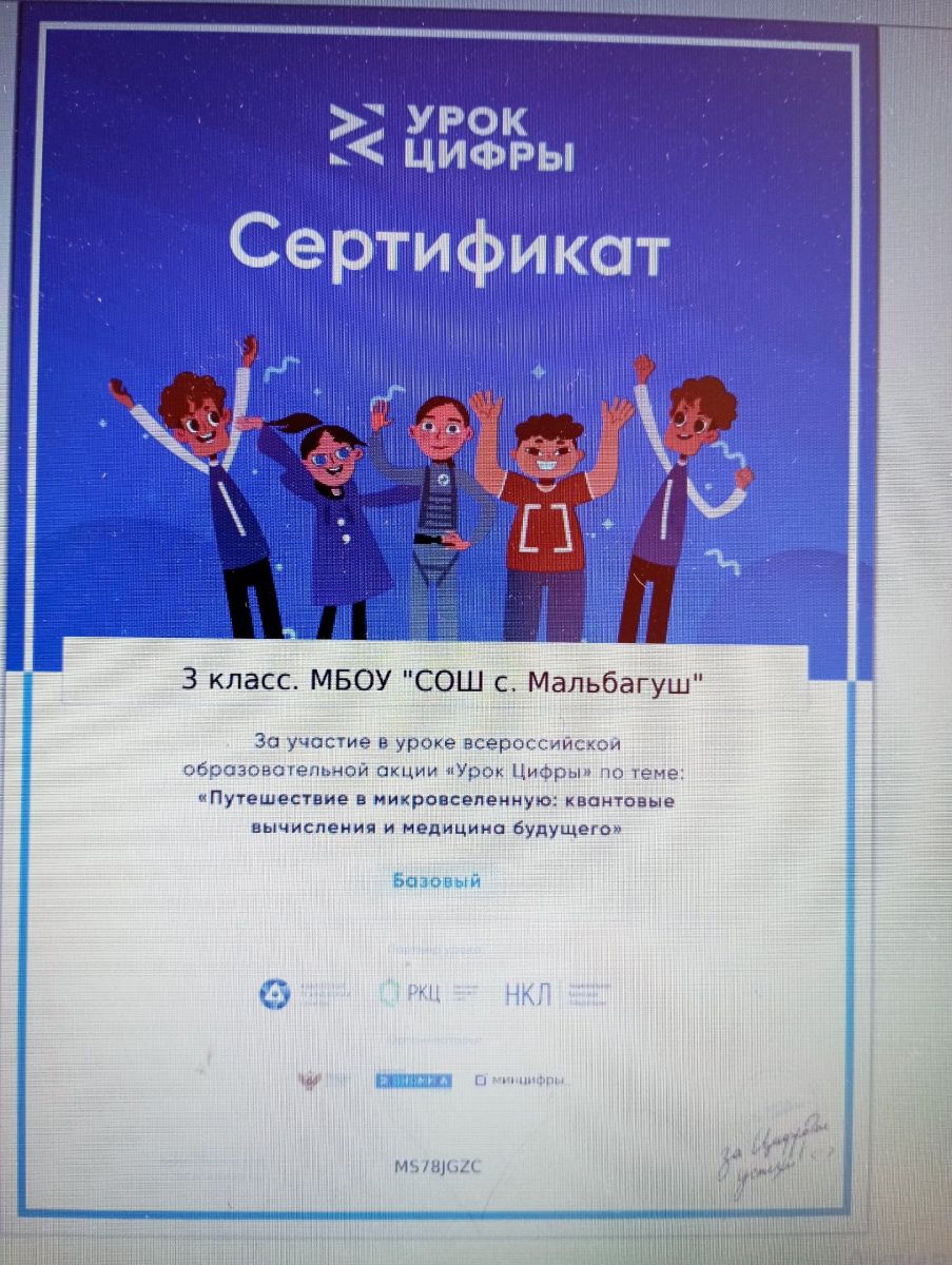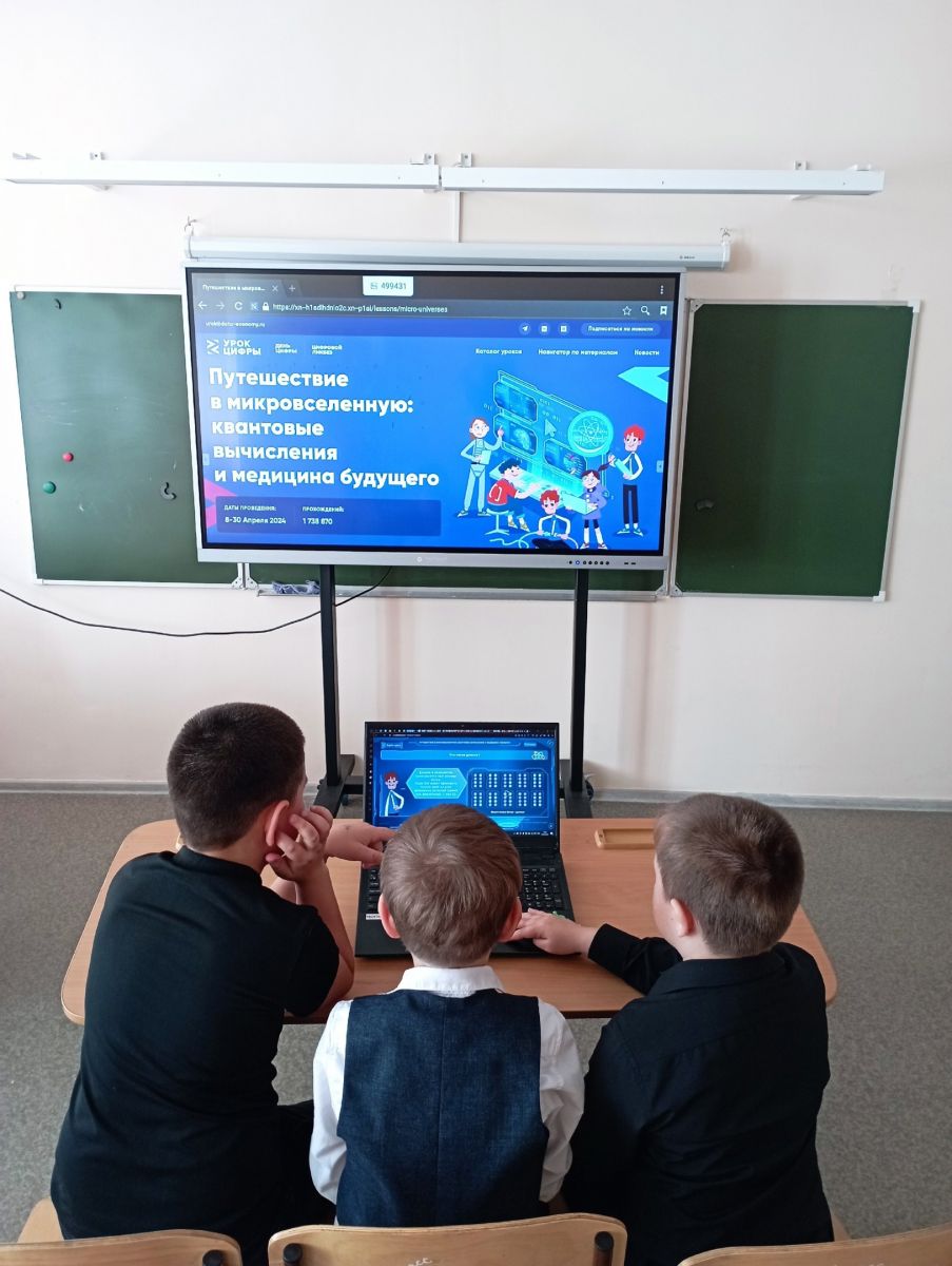 В нашей школе, в 1,3 классе прошёл урок цифры по теме: "Путешествие в микровселенную". Ученики узнали, что такое квантовый компьютер, квантовые вычисления, для чего они нужны, их связь с медициной, с какими профессиями связаны; поработали в группах над заданиями, зашли на сайт урокцифры.ru, чтобы поработать на тренажёре. Учащиеся начальных классов поработали на тренажёрах и получили сертификаты.