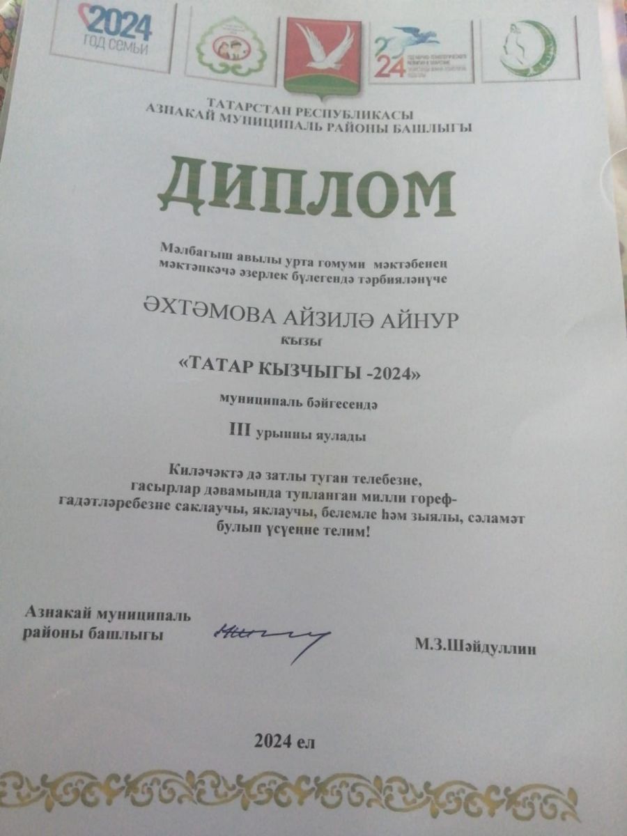 Әхтәмова Айзилә “Татар кызчыгы- 2024” бәйгесенең муниципаль турында бик матур чыгыш ясап , 3 нче дәрәҗәле дипломга лаек булды. Айзиләне чын күңелдән бу уңышы белән котлыйбыз! Киләчәктә дә безнең бакчабызның һәм татар милләтенең горурлыгы булыр дип ышанып калабыз.Аның бу җиңүендә бакчабыз тәрбиячеләренең дә һәм әти-әниләренең дә өлеше зур булды. Әти-әниләренә бәйгедә катнашуга ризалык биргәннәре һәм ярдәм иткәннәре өчен зур рәхмәтебезне белдерәбез!