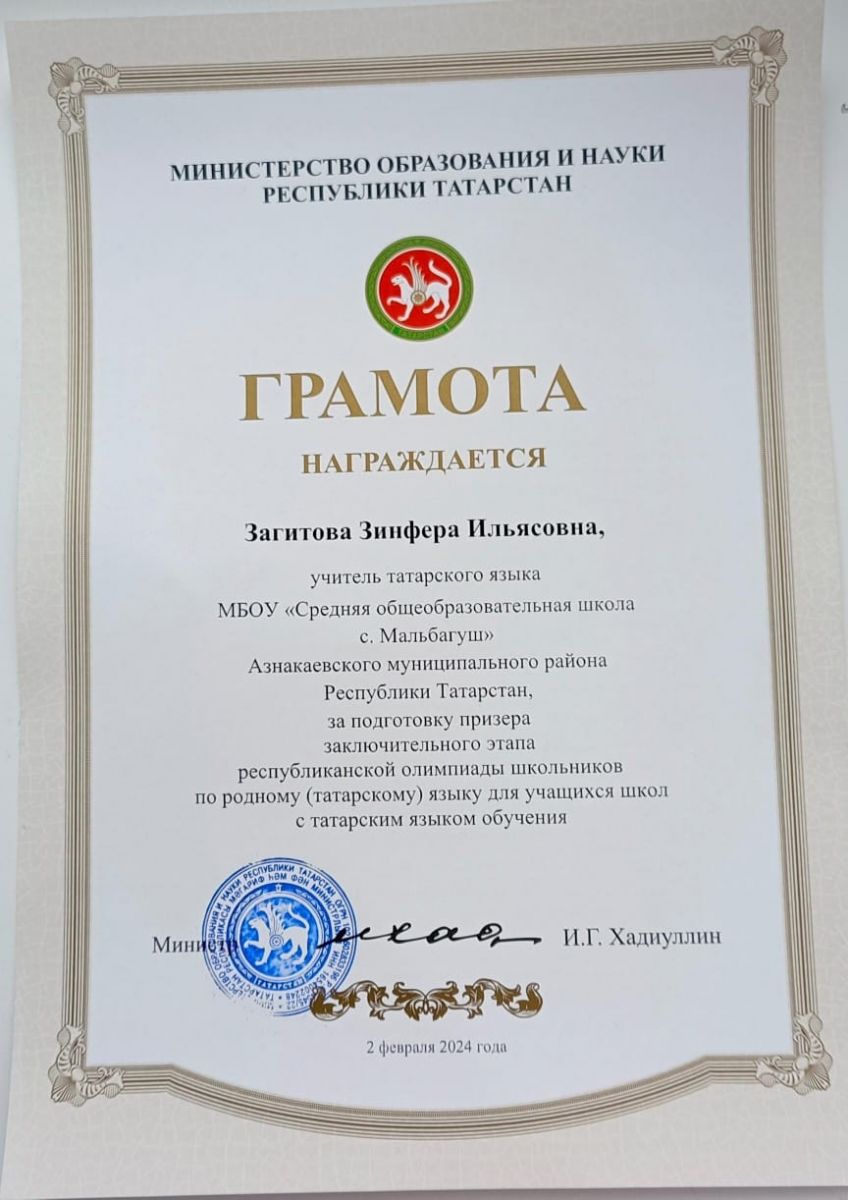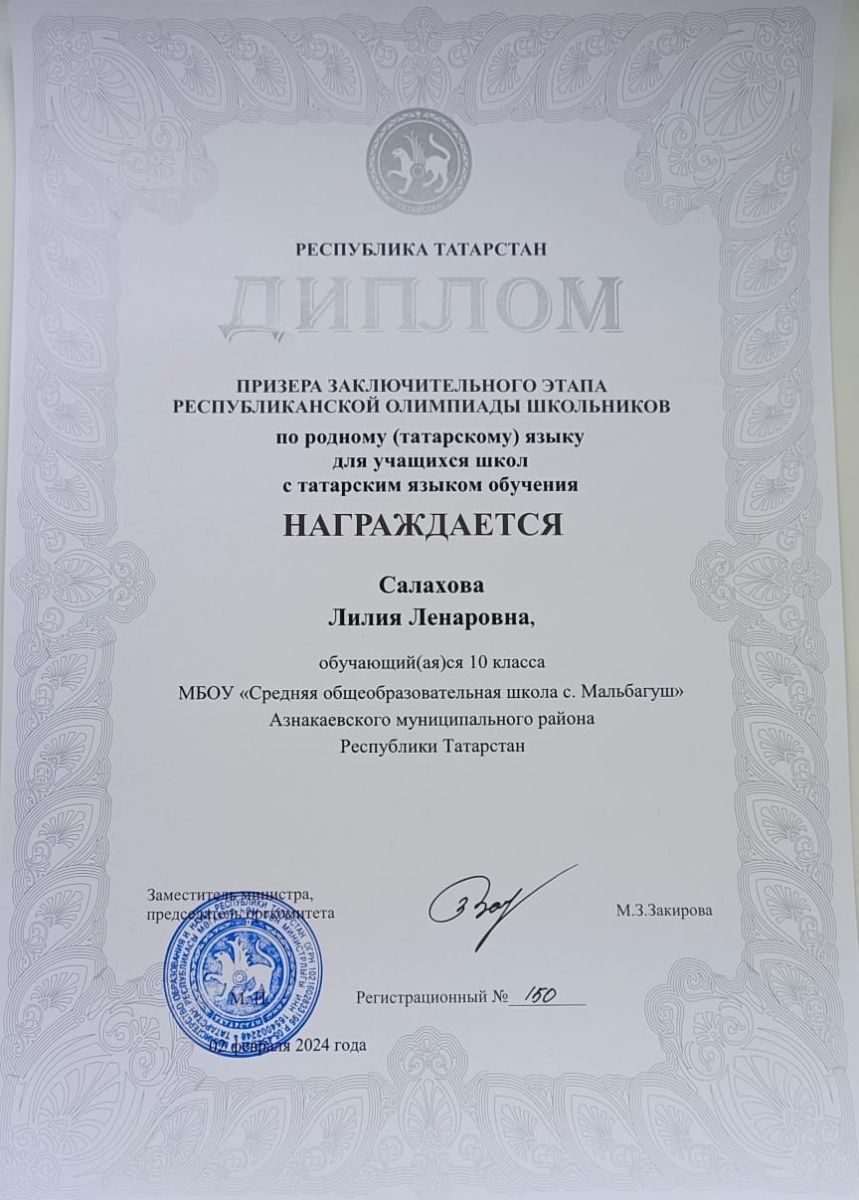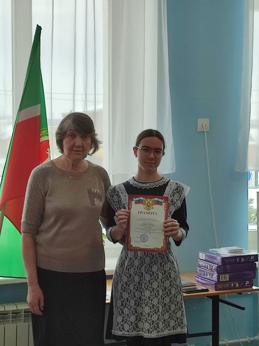 Поздравляем призера Республиканского этапа Всероссийской олимпиады по татарскому языку Салахову Лилию и учителя татарского языка и литературы Загитову З.И.