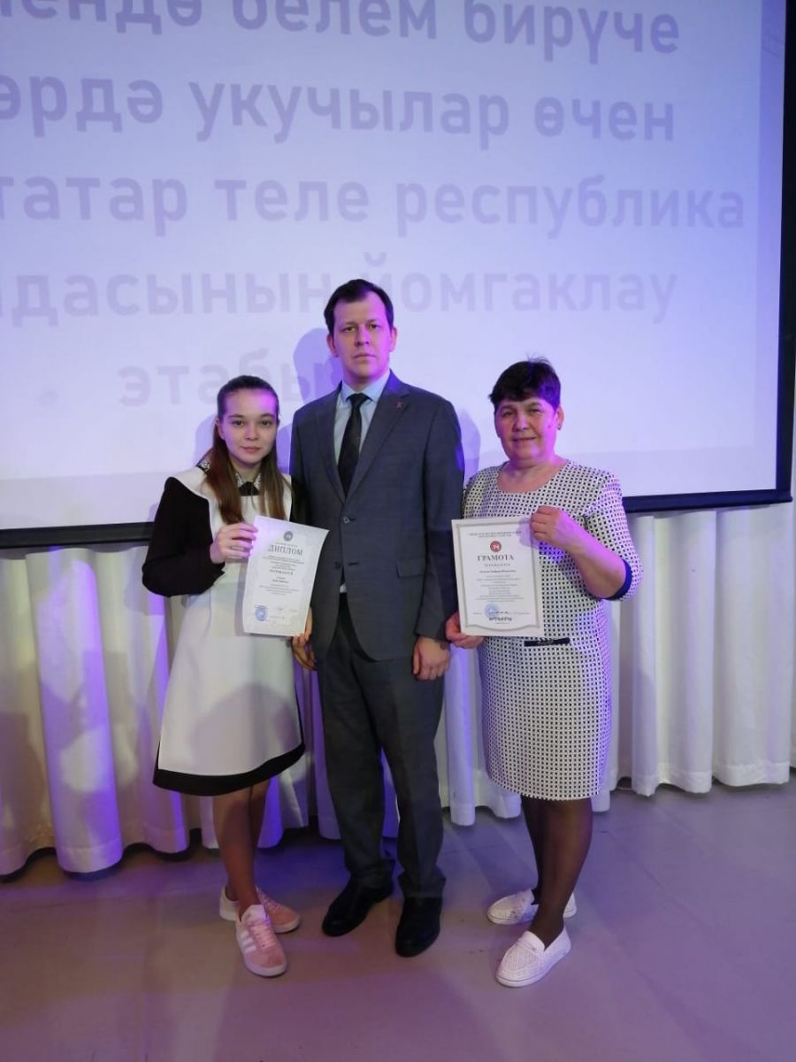 Татар теле буенча Бөтенроссия олимпиадасының Республика этабы призеры Салахова Лилияне һәм татар теле һәм әдәбияты укытучысы Заһитова З. И. җиңүләре белән тәбрик итәбез.