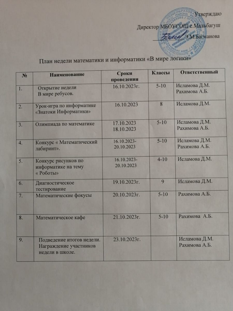 План недели математики и информатики/ Математика һәм информатика атналыгының эш планы 16.10.2023