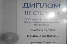 7 нче сыйныф укучысы Шәйхиева Язгөл физика буенча 5 нче шәһәр республикакүләм олимпиадада 3 нче урынга лаек булды һәм 3 нче дәрәҗә диплом белән бүләкләнде.
