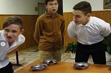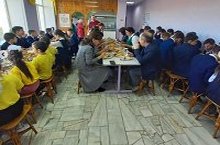 Уңыш бәйрәменең иң күңелле мизгелләре ашханәдә тәмле ризыклар белән сыйлану инде, әлбәттә. Ә ашханәгә кергәндә һәр сыйныф җырлап керә.