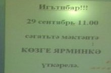 29 сентябрь сәг 11.00 дә мәктәптә КӨЗГЕ ЯРМИНКӘ үткәрелә.