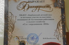 Авыл хуҗалыгында эшләүче хезмәткәрләрнең слетында безнең балалар бакчасы күргәзмә белән катнашып мактау хатына лаек булды.