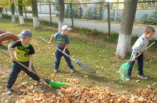 Мәктәпкә әзерлек төркеме балалары уен мәйданчыгында коелган яфракларны җыюда булыштылар. Авыл малайлары икәнлекләре әллә каян күренеп тора: себеркене дә бик оста тоталар, артларында чүп тә калмый, бик яхшы себерәләр.
