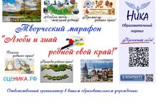 С целью патриотического воспитания молодежи образовательный портал «НИКА» (https://оценика.рф), являющийся всероссийским сетевым СМИ (свидетельство Роскомнадзора РФ ЭЛ № ФС 77-65747 от 20.05.2016 г.), приглашает учащихся и воспитанников образовательных организаций, педагогов и родителей вашего региона с 01.11.2018 г. по 31.12.2018 г. принять участие во Всероссийском творческом марафоне «Люби и знай родной свой край!» (далее – Марафон).