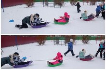 Дети подготовительной группы любят игры на свежем воздухе. Они с помощью салазок организовали интересную игру "Паравозик".