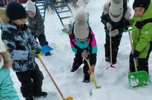 Мәктәпкә хәзерлек төркеме балалары уен мәйданчыгын кардан чистарттылар. -