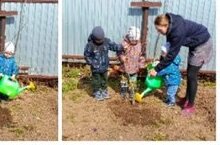 Воспитывающие дети группы раннего возраста принимают активное участие в посадке деревьев на участке детского сада.