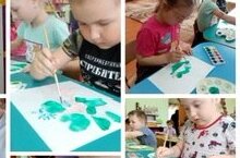 Цель: продолжать знакомство с нетрадиционными способами рисования (набивкой пенопластом). Формирование навыка совмещения различных приемов рисования ( кистью и пробкой). Учить использовать разные оттенки, разбавляя или сгущая один цвет, развивать чувство цвета.